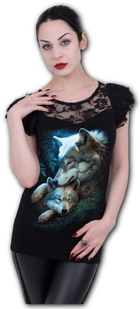 Dámské tričko s velmi profesionálním potiskem firmy Spiral Direct, která již přes třicet let zabývá potiskem merche s motivy, jako jsou lebky, draci, vlci, kočky, motorky, vikingové, metalové kapely, filmy.